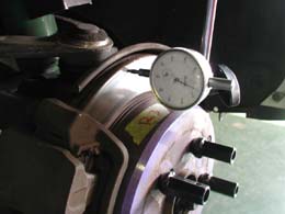 リアローターの振れを計測します。 なんと、計測値が冷間と温間で違うのです。 計測値は左右ともに0.2mmでした。 スリットによりセクションが分かれますが、セクション毎の高低差もあるようです。 |