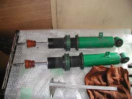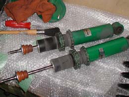 ダンパーの減衰力は前後とも、全然足りません。 車両に装着する前から「一番固い」にセットして、 リバンドストロークを調整して、イニシャルセットを造ります。 |