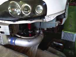 弊社のバンパーは開口部を大きく、低く冷気を導入する為に インタークーラーの位置が合いませんので インタークーラーをさげます。 |