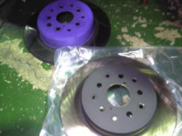 リアブレーキロータは、社外品が付いていて、いつのまにか粗悪品が入っていましたので 無断で交換させてもらいました。 オーナー様の御希望によりセンター部は艶消し塗装が施ました。 |