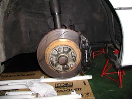 リアは332φのローターに996カレラのフロントを取付。 (フロントをリアに?ちなみに回転方向が逆に付いてます。そんな事も知らないの?) こちらもパッドはノーマル…パッドはノンサーボ用に変えないといけないんですよ… |