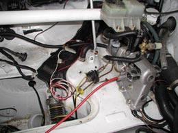 これぞ、コンガラがっている見本です。 黄色の線はフェ−ルポンプ電源線、おそらく、87の配線で動かそうとしたけど動かなかったので、急きょ993のモトロニックで動かす事にしたのでしょう。 |
