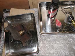ジャダーは発生すると車体全体に及ぶため、部品の特定ができません。プロペラシャフトのセンターベアリングまで疑いました。 ブレーキが起因しているので、ブレーキから始めます。 スライドピンの固着もありません。 不安要素を消したいので、リアキャリパをOHします。 |