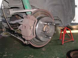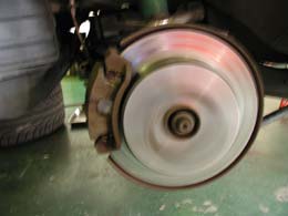 フロントに罪は無いので、再考します。 以前経験のあったリアブレーキを診ます。 リフトアップした状態で走行状態を造り出し、「180km」からのブレーキングを試みると… ジャダー出ました。 |