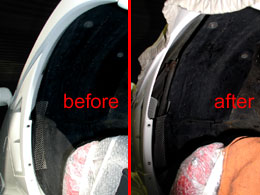 フェンダー加工です。 車高も落としますし、ギリギリワイドのホイールセットにしたいので 形が変わらない所まで、全て切り落とします。 インナーフェンダーが合わなくなりますので切り落とします。 メインハーネスやフレームのリブが有りますので上側のみ残します。 |
