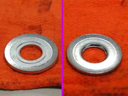 そのワッシャーは材質が弱く、Cクリップの当たり箇所が凹んでいました。 左はマウントの上側でナットで締められていた方で、内径の所が角が立っています。 右はCクリップに接触する方で、Cクリップの当たる角が凹んでいます。 こういうモノなのでしょうか?でも、もう、抜けそうです。 ダンパーのロッド径が15.0ミリの所、ワッシャーの内径は15.3あります。 Cクリップ外径は16.5でした。 良く判らないですが、危険と判断しました。 大丈夫な事もありますが…精神的によろしく無いので… |