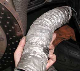 ブレーキエアダクトが朽ち果てていたので、交換です。 取付もツバ付きパイプにタイラップでしたが、確実な止め方に変更です。 |