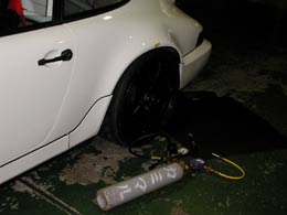 ポン付け状態のJRZはすでにサーキット走行のシェイクダウンも済んでいます。 当方で状況を把握していないので、チェックをします。 で…タイヤのエア圧が足りません。 ダンパーのガス圧調整用の窒素を入れておきます。 2.3kg |